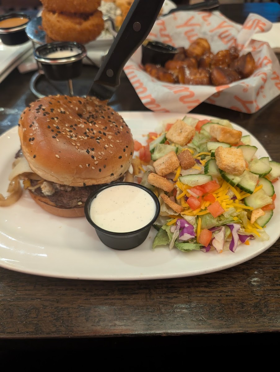 Let’s talk about the food-because that’s where Red Robin truly shines. Popular menu picks include the Towering Onion Rings, a crispy, golden showstopper that’s perfect for sharing, and the Bacon Cheeseburger, loaded with smoky bacon and melty cheese. If you’re in the mood for something classic, the House-Battered Fish & Chips is always a winner, while veggie lovers rave about the Veggie Burger paired with their famous Bottomless French Fries (yes, you can eat as many as you want). For comfort food fans, the creamy Mac and Cheese and Pretzel Bites are must-tries.